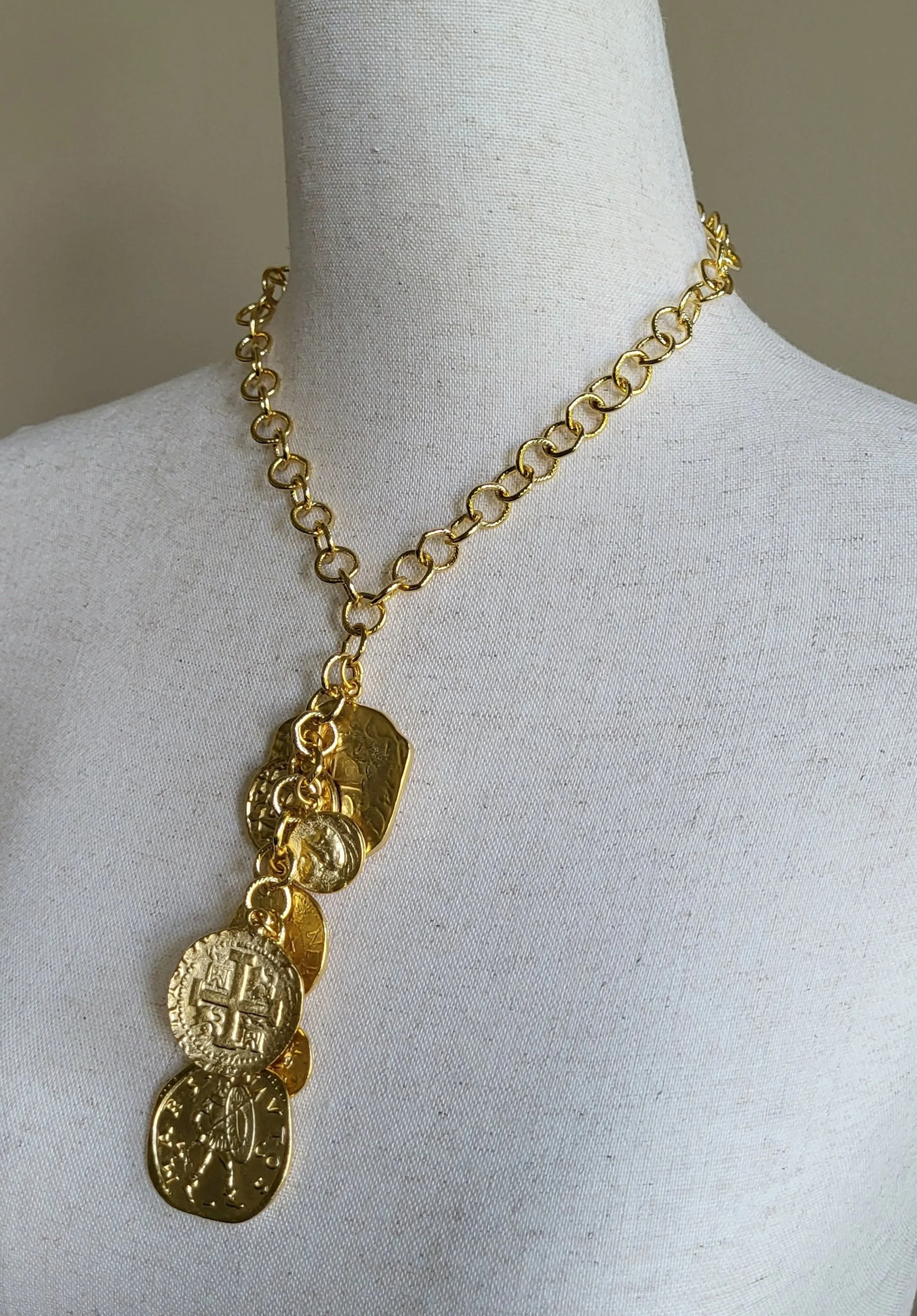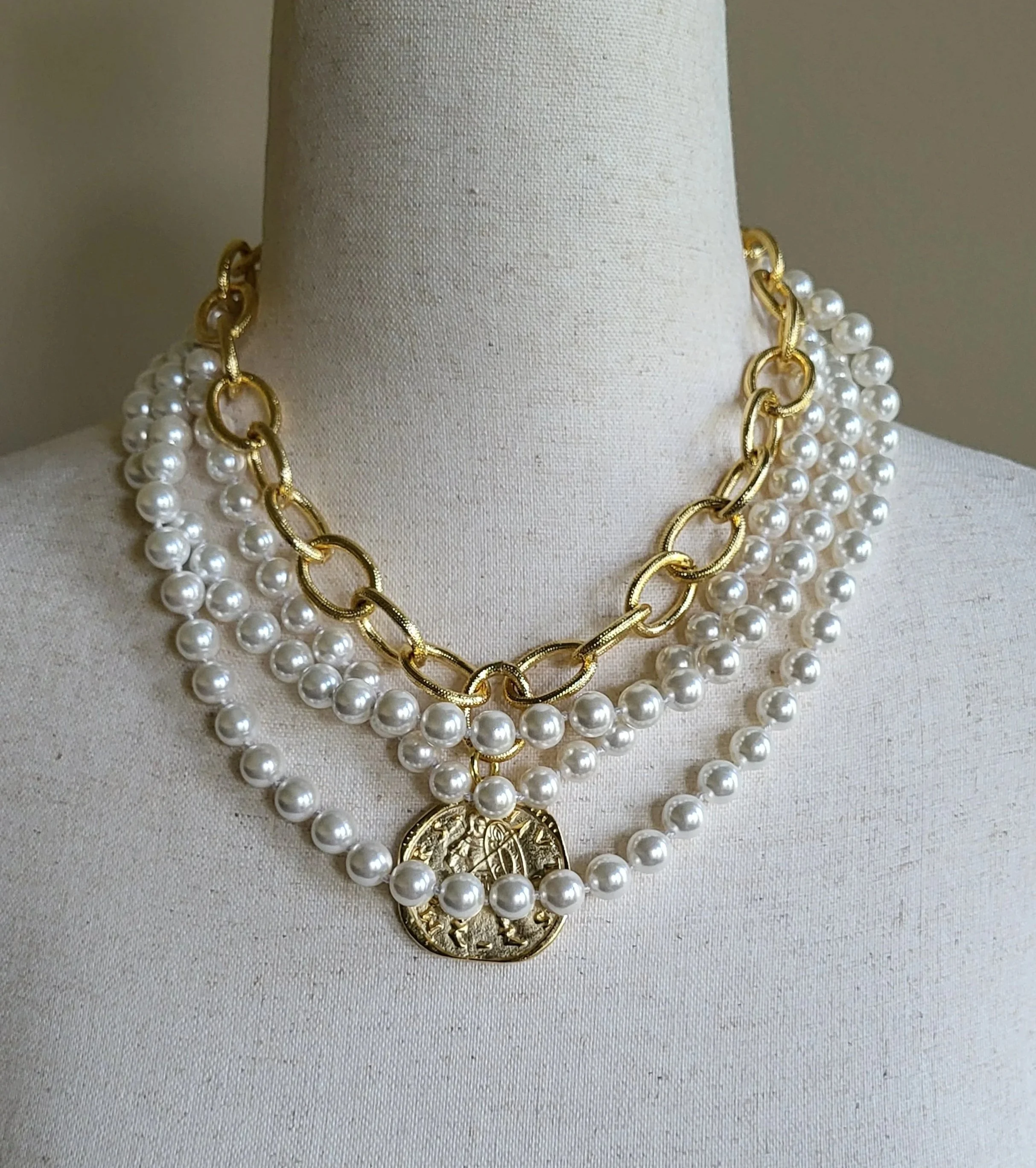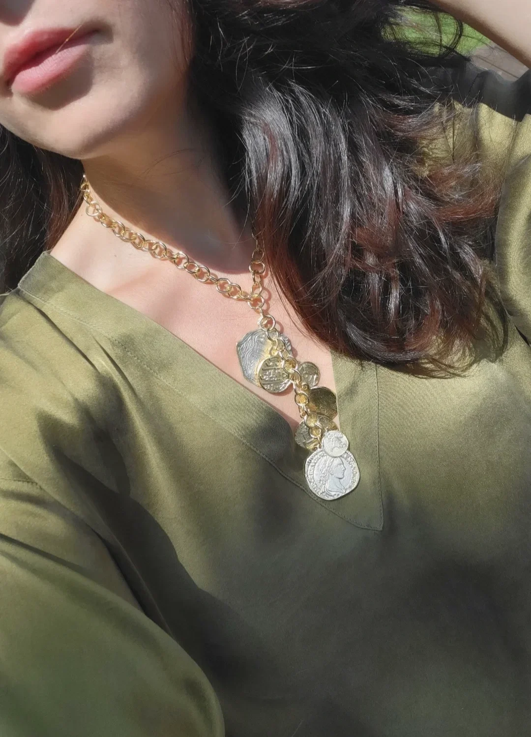 The Halo Quartz Necklace is a piece that feels both ancient and celestial. The chunky quartz crystal is set in an 18k gold gilded band with small stones that catch the light, suspended within a golden ring like a relic once hung in a chapel window. Each pendant is a quiet emblem of light, protection, and devotion.